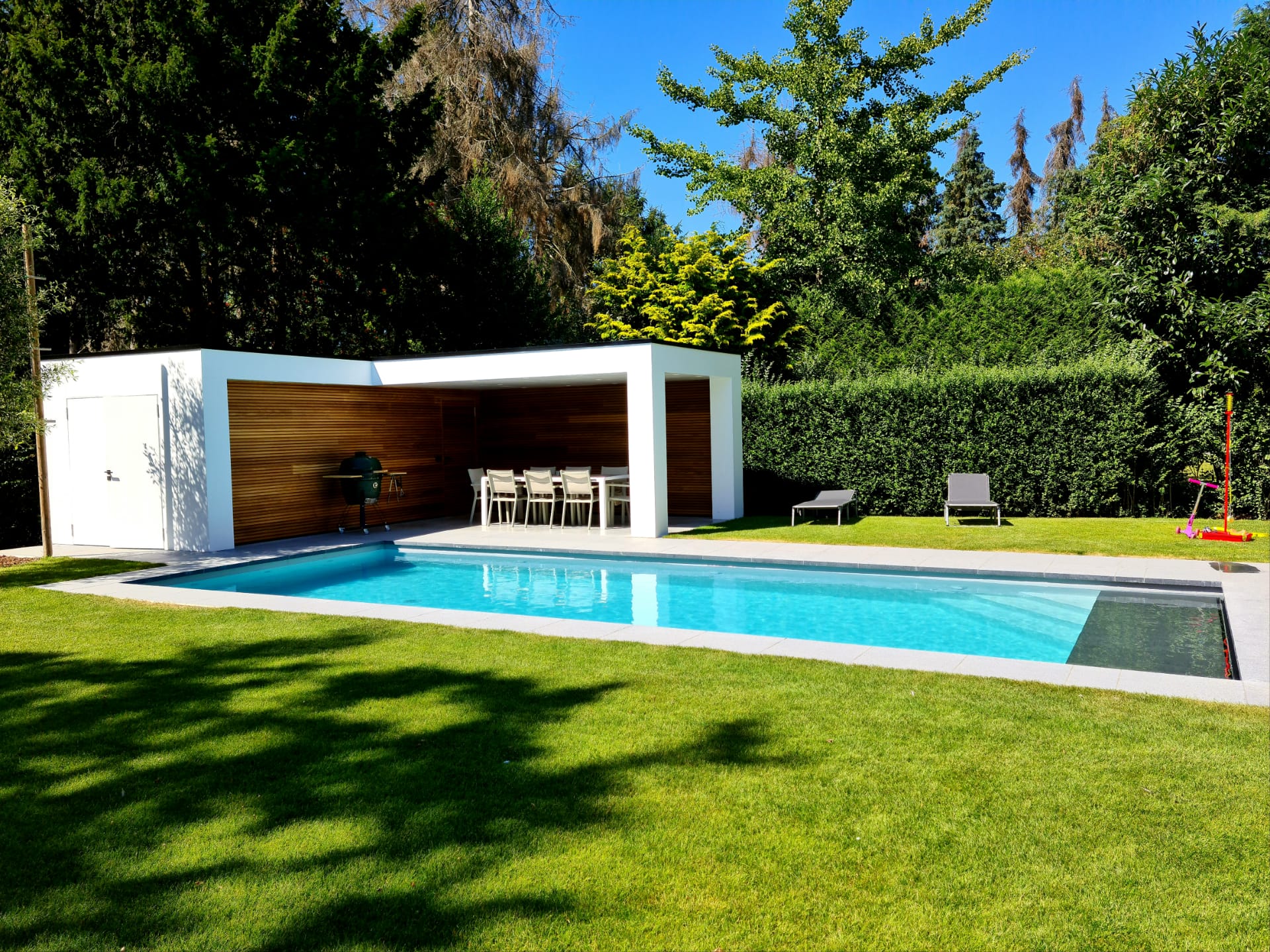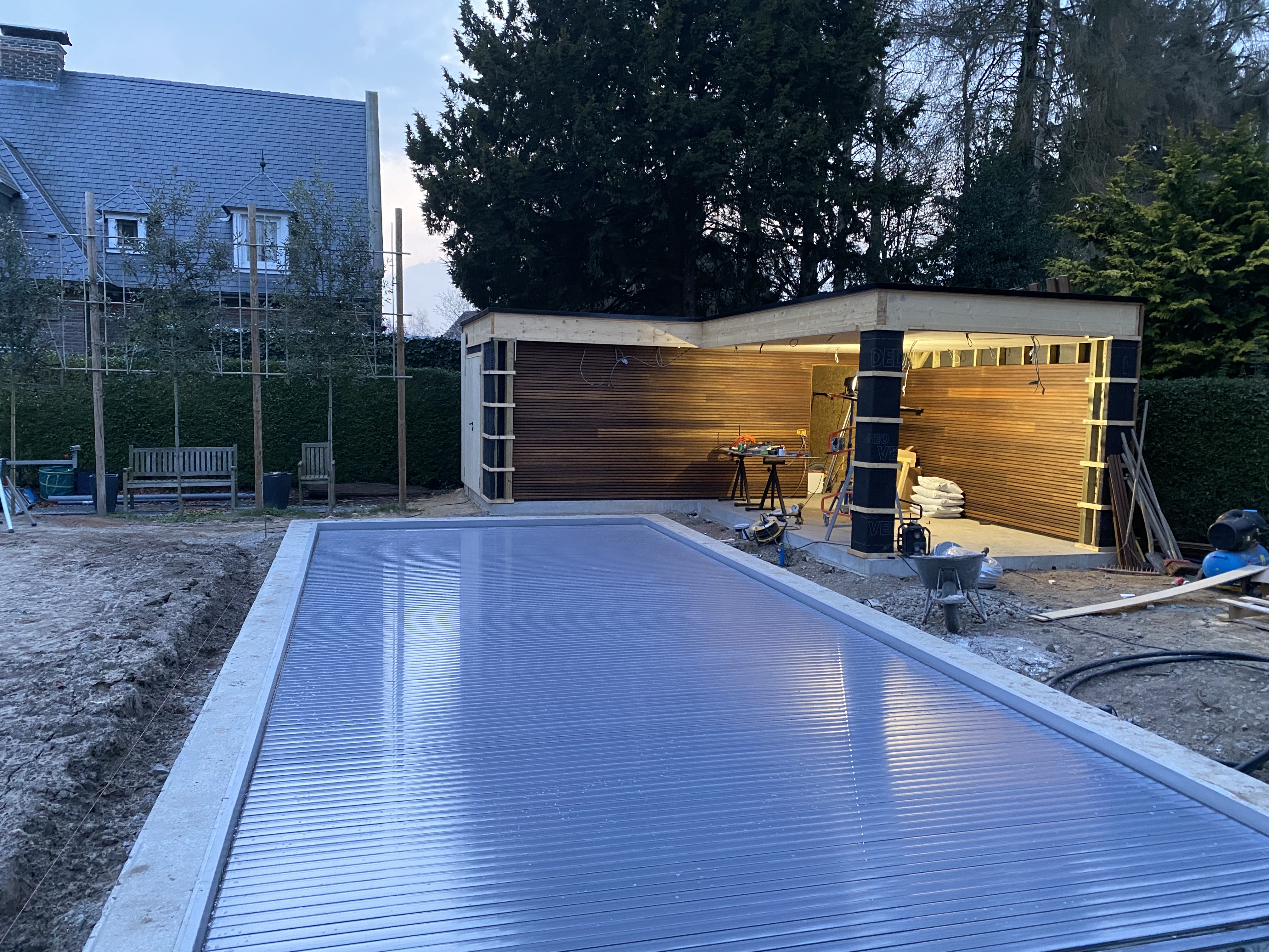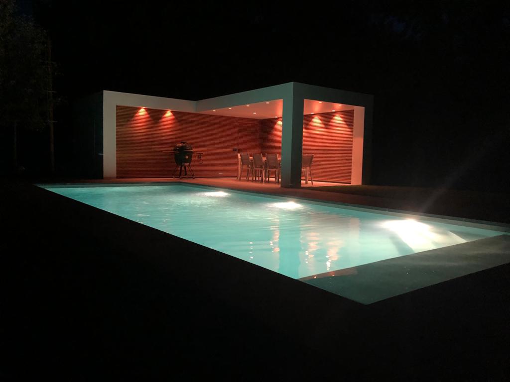 Verder is er een douche , een kleedruimte met toilet en lavabo voorzien en apart ook nog een opbergruimte waarin ook de technische installatie verwerkt zit. In de oversteek van de poolhouse zijn verschillende lichtkringen die vanop de smartphone kunnen bediend en gedimd worden voor de perfecte sfeerverlichting. Er werd ook wifi en warm water voorzien voor ultiem geruiksgemak:-)