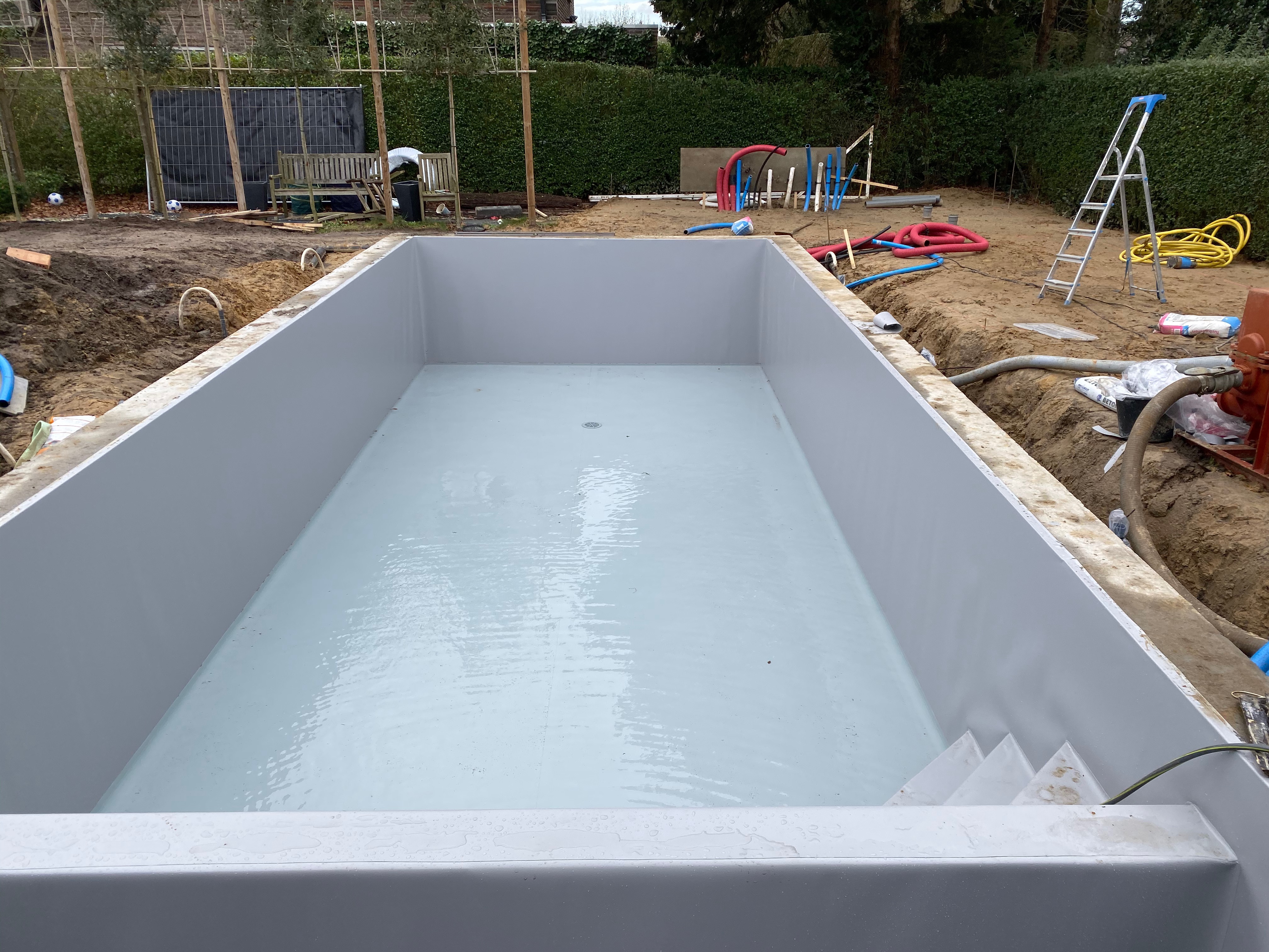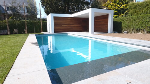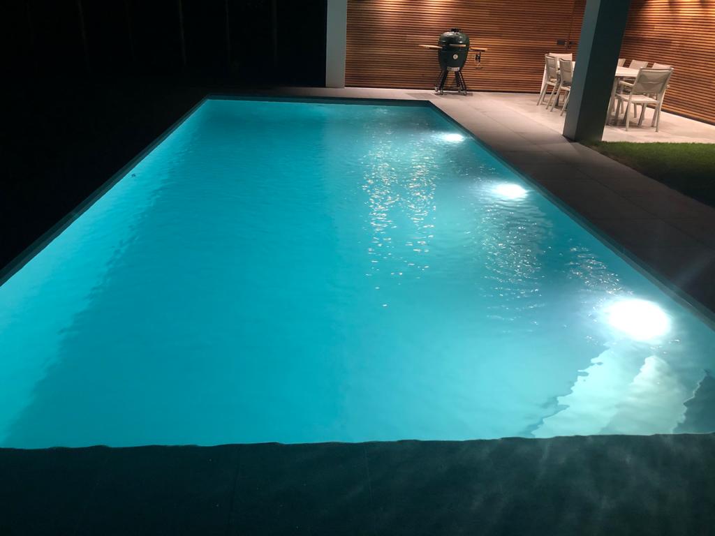 Het zwembad bestaat uit een dubbel gewapende betonkuip met wanden van 30 cm dik en afmetingen van 10 m x 4 m x1,5 m .Verder ook een op maat gemaakte driehoekstrap , een polycarbonaat solarrolluik met onderwaterplage en 3 led adagio pro lampen .Voor de verharding koos de klant voor een granieten steen van 60cmx60cm met rechte neus .