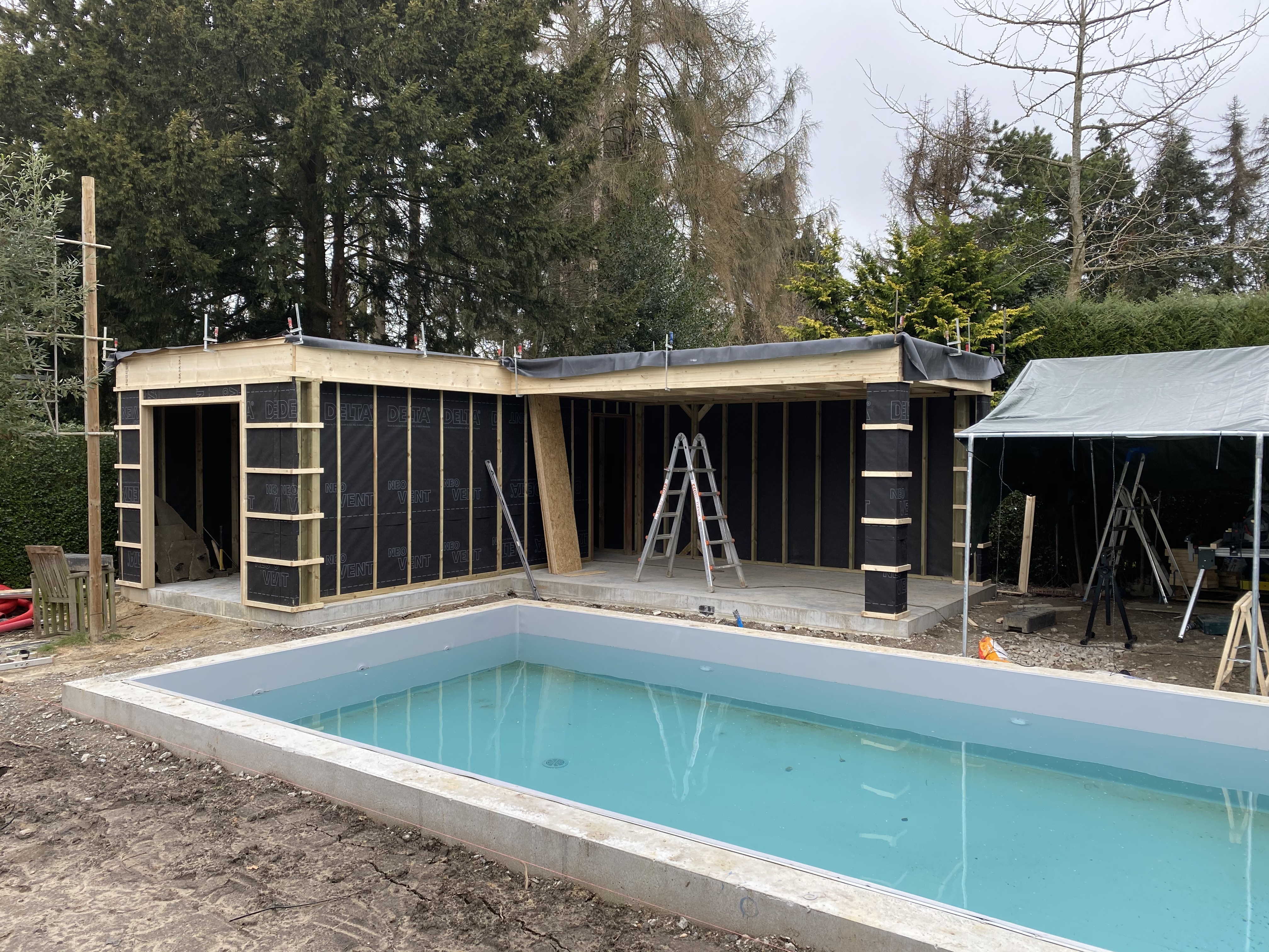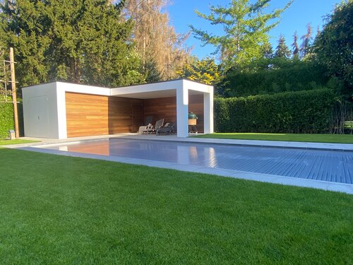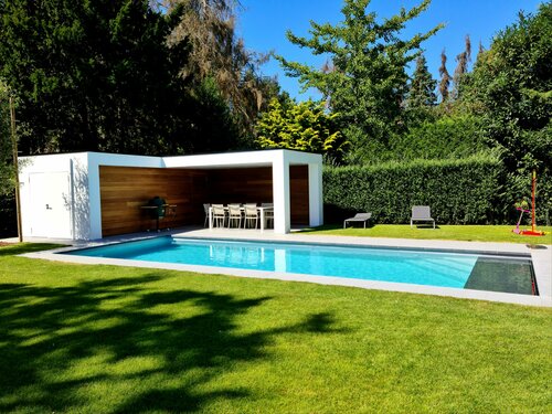 De Poolhouse is volledig op maat gemaakt volgens de wensen en noden van de klant . de gepolierde betonplaat is gepigmenteerd zodat deze perfect aansluit bij de granieten steen . De buitenafwerking bestaat uit 3 soorten hout :Tricoya ,Ayush en thermowood grenen voor de achterzijdes