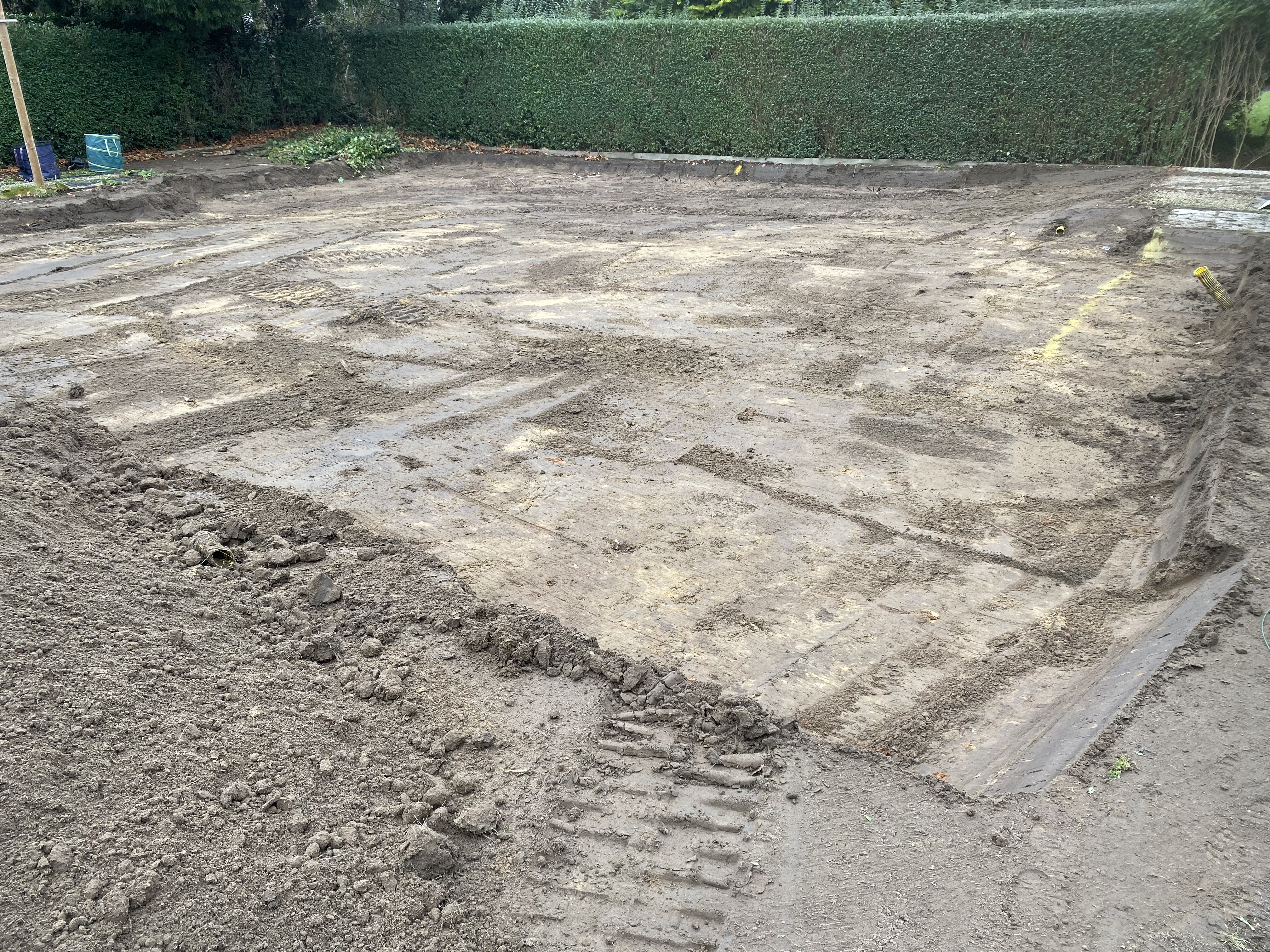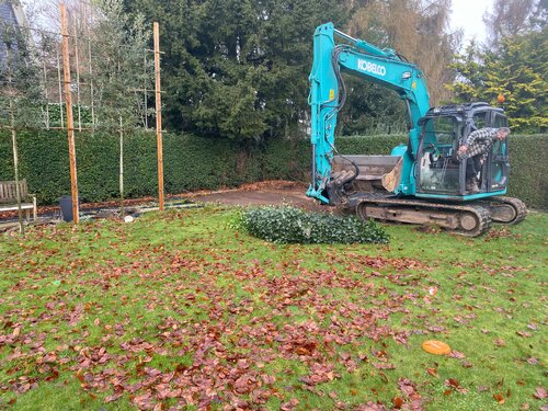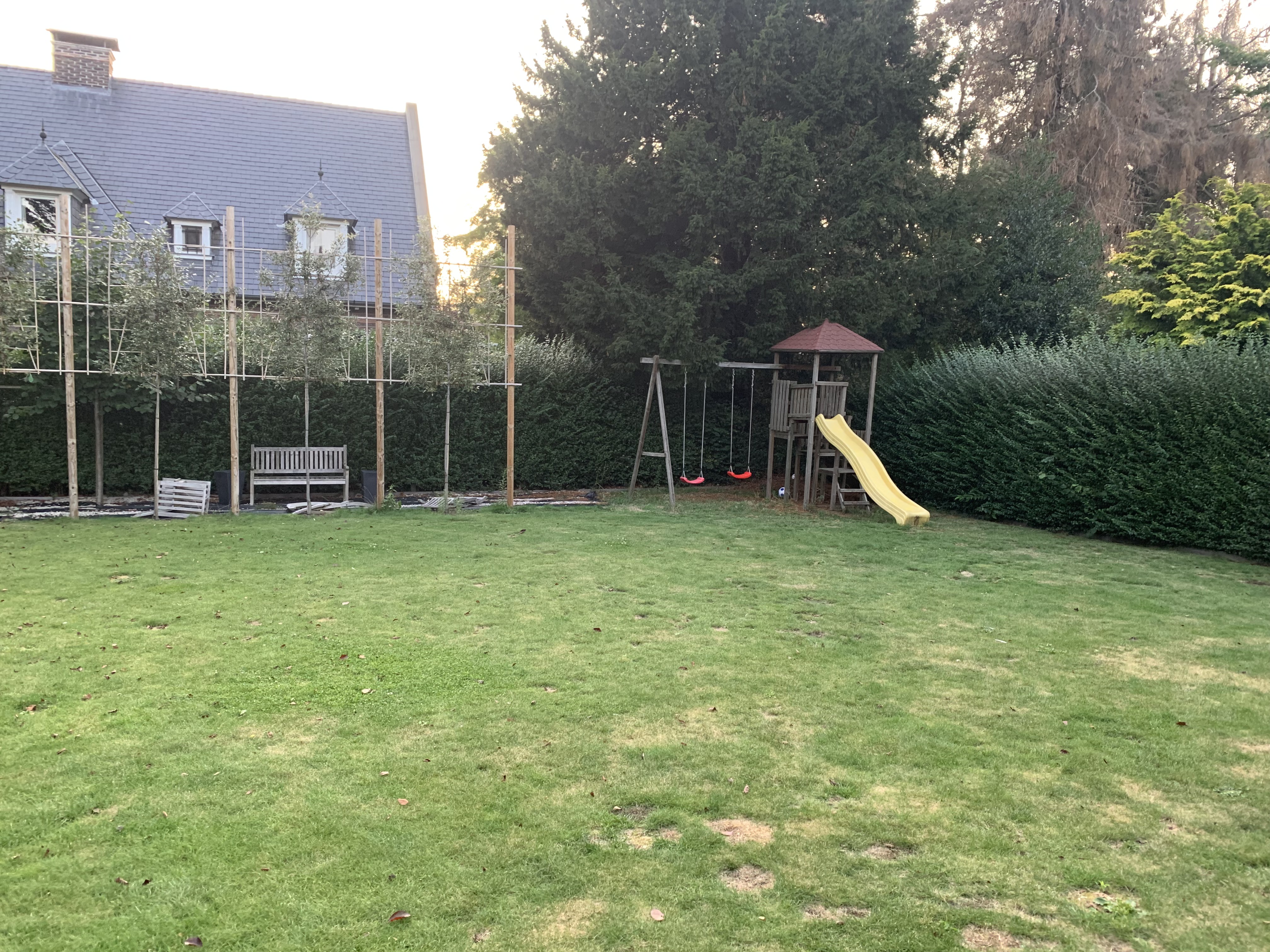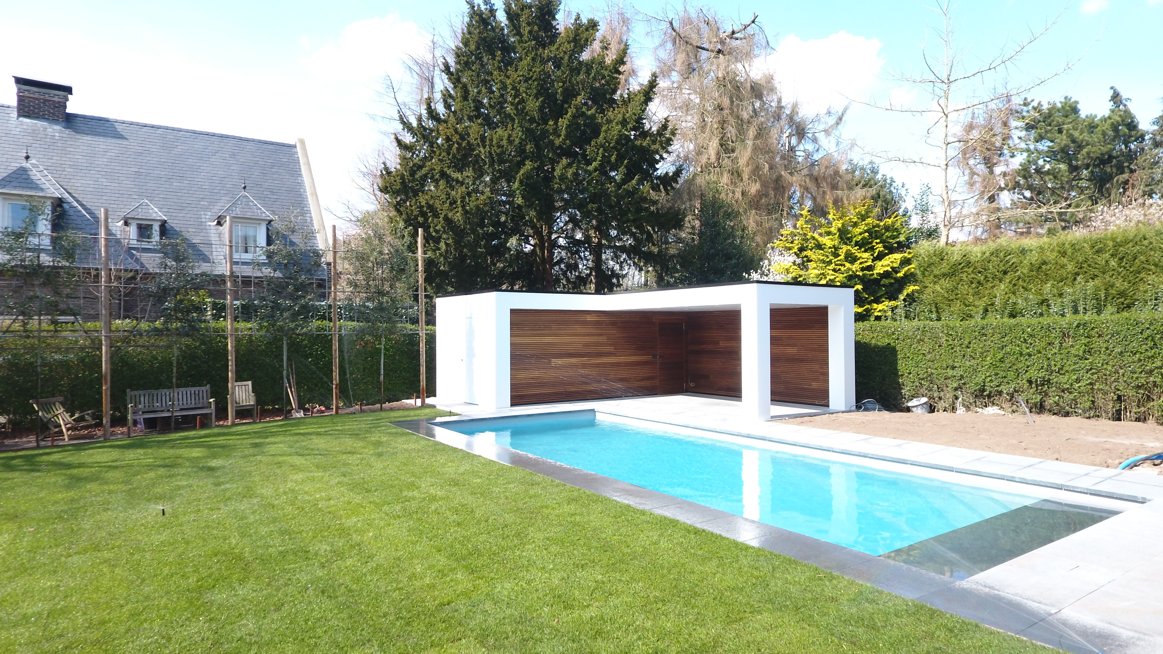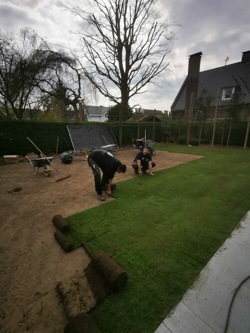 In de tuin werd een volledig geautomatiseerde beregening geplaatst zodat de nieuwe graszoden ten alle tijd van het nodige water kunnen genieten .